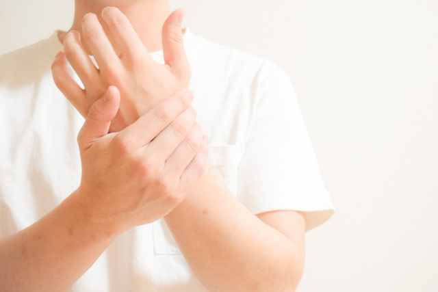 手首の内側に筋肉や神経を束ねる屈筋支帯という組織があり、そこが狭くなったり炎症したりすることで神経が圧迫されて指に痺れがでたり手首に痛みが現れます。